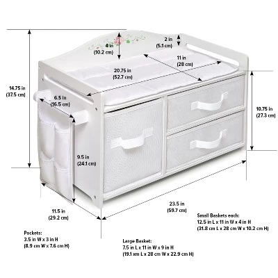 Badger Basket’s White Rose Doll Care Station offers one place for storing and organizing your doll’s things, changing her, and then putting her to bed! The silk-screened rose and leaf design is bursting with pretty pinks and spring green to complement the solid white finish. Fill up the three removable baskets with all of your baby doll’s stuff. One large and two small baskets accommodate all sorts of doll clothes and accessories. The baskets are fully removable and can be used separately. Baskets also can fold flat for storage by simply removing the bottom panel and folding the basket body. Grab the basket handles to quickly open the drawers and check your supplies. Never lose those small items! The pocket organizer on the side has four equal pockets to keep little things at hand like a bottle, hairbrush, or pacifier. Organizer secures with hook-and-loop tape, and can be removed if you want to use the side bar for hanging clothes or towels. Your dolly won’t mind lying down on the soft, quilted, and padded mat on top to have her clothes or diaper changed, or to go nighty night. Open back design so the baskets are accessible from either side. Can also be used as a vet station when examining and caring for your stuffed pets! Designed for dolls up to 20 inches. Fits 18 inch dolls such as American Girl, My Life As, Madame Alexander, and Our Generation; and also fits 15 inch American Girl Bitty Baby dolls and 14.5 inch American Girl WellieWishers dolls. Care Station is made with durable engineered wood with a white, painted finish. Fabric is 100% polyester fabric with 100% polyester fill. Baskets are made with non-woven fabric and internal cardboard support panels. Overall assembled dimensions: 23.5 inches L x 11.5 inches W x 14.75 inches H. Width not including side bar: 21-5/8 inches W. Floor to top surface: 10.75 inches H. Floor to top of side panel: 13 inches H. Floor to top of side bar: 9.5 inches H. Top surface to top middle of back panel: 4 inches H. Top surface to top of side panel: 2 inches H. Interior of bed/changing area: 20.75 inches L x 11 inches W. Width of Bar (where pocket organizer attaches): 6.25 inches W. Width of Side Bar including supports: 7.5 inches W. Padded Fabric Mat: 20.5 inches L x 10.5 inches W. Fabric Organizer: 6.5 inches W x 9.5 inches H (pockets 3.5 inches W x 3 inches H). Large Basket: 7.5 inches L x 11 inches W x 9 inches H. Large Basket Opening: 7.75 inches W x 11.5 inches D x 9.25 inches H. Small Baskets each: 12.5 inches L x 11 inches W x 4 inches H. Small Basket Opening: 12.5 inches L x 11.5 inches W x 4.5 inches H. Assembled weight: 12.5 pounds. All measurements approximate. Frame can be wiped clean with a damp cloth and mild soap and dry thoroughly. Spot clean fabric and baskets as needed with cold water and mild detergent and allow to air dry. Never immerse the baskets in water due to the internal cardboard support panels. Adult assembly required. Illustrated instructions included. For children from three years old and up. This item is to be used with dolls only and is never to be used with real infants or pets. /! WARNING: CHOKING HAZARD – Small parts. Not for children under 3 yrs. Product complies with all currently applicable safety standards. Product includes a limited warranty of 30 Days Parts to the original purchaser. Doll and doll clothes/accessories not included. Product may vary slightly from shown and described. Props/accessories shown are for illustration purposes only and are not included with the product. Actual color/finish may vary slightly from screen display. This item ships in its original carton which may include a product photo.