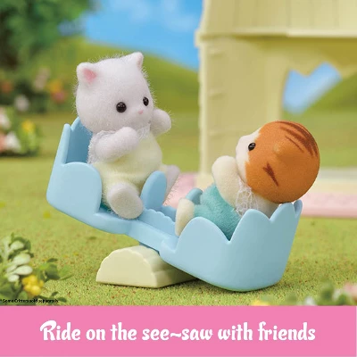 Calico Critters miniature dollhouses, playsets and figures are timeless and classic high-quality toys. Babies loves to ride and play at the Windmill Park! This fun pastel playset features manual rotating Windmill with two gondolas, slide, and see saw. Set includes Ryan Persian Cat Baby who is poseable and dressed in removeable clothing. Set atop of the Baby Castle Nursery for more fun! Play together with Nursery Series playsets including Baby Castle Nursery, Sunshine Nursery Bus, Baby Balloon Playhouse and more!
