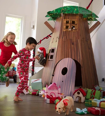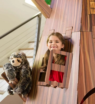 An enchanted indoor tree fort? Build your engineering and problem-solving skills, and discover endless imaginative play, with our Constructagons® Big Tree Fort Indoor Fort-Building Kit! Once assembled, the 84″H x 58″ diam. cardboard tree offers plenty of space for lots of little ones to play with their favorite toys or games, or provides a cozy hideaway (add your favorite blankets and floor pillows for extra comfort). You can even add battery-operated string lights for extra sparkle (sold separately). Our creative building set includes 20 sturdy cardboard pieces that easily slot together to form the tall, sturdy tree, and features 4 windows and a large door that each open and close to let in extra air and light. Use the included connectors and hook and loop tape (with a little help from adults) to quickly and easily assemble this indoor play space in your playroom or classroom. It’s the perfect place for kids to pretend the day away, or hide out with a favorite book! This fun, educational, creative toy provides endless fun for little engineers; and it’s perfect for independent or group play. Besides the obvious fun factor, fort-building improves cognitive skills like problem-solving and planning, and practical skills in building and constructing. Makes a great birthday, Christmas, or anytime WOW gift!