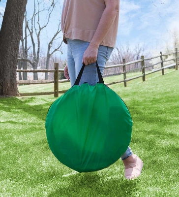 Active and creative kids will love crawling and running through our 4-piece set of Pop-Up Play Tents and Tunnels. Made of durable polyester with mesh features, these bright green pieces are for indoor or outdoor play. In bright shades of green, these tents and tunnels make a cool secret hiding place during a game of hide and seek, add an extra fun addition to an obstacle course, or just provide a cool place to hang out and play thanks to the elevated tent top. This pop-up play set includes two 60″L tunnels with a mesh top for visibility, and two 53″H tents with plenty of room to play inside. The four pieces connect together (with the attached olive toggles), or can be used separately for more play opportunities. Use the toggle to keep the tent entryways open when desired, or lower the flaps and keep them in place with the attached hook and loop tape.Pop-up assembly is super easy with a little bit of help from an adult—just untwist the components, then snap the pre-assembled tent poles into the roof of the tent (instructions included). And it’s perfectly portable! Twist and fold the pieces into the included carry bag, and take it with you wherever you go. Includes eight ground stakes.Inspire active, imaginative and creative play with our Pop-Up Play Tents and Tunnels!