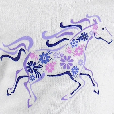 - QUALITY DETAILS: The white tee shirt features a beautiful, galloping horse in purple and navy filled in with a flower design! The black leggings feature lace trimmed ankles and tall classic riding boots have ties in the front and a back zipper and beautiful stitching. A traditional velvet covered equestrian helmet completes this detailed set!